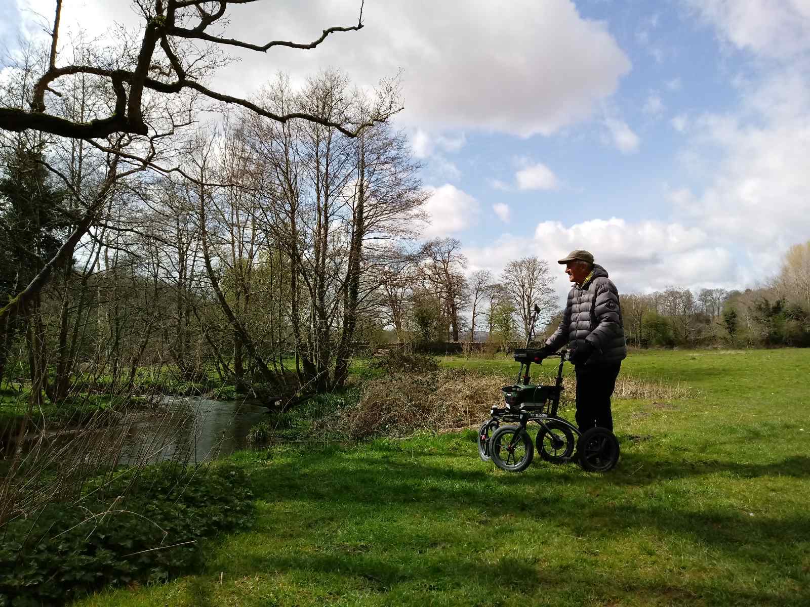 我可以使用这款助行车在田野和河边不平整的路面上出行,我发现我可以迈出更大的不发,站的更为直立,因此我可以更快的行走了!我还没有机会在城镇中使用这款助行车,但是我相信它能轻松通过鹅卵石以及石头路面。