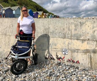 我一直想联系你们,让你们知道我的 Trionic Veloped 助行车给我生活带来的巨大变化。它能够让我到我居住的海滩等地方去散步,而且不会担心摔倒。给我再次恢复了独立和信息。这是我和著名艺术家班克斯在我和我家人居住的克罗默完成的一幅模板画的合影。它不久前在英国诺福克海岸进行了一次 "喷绘之旅"。